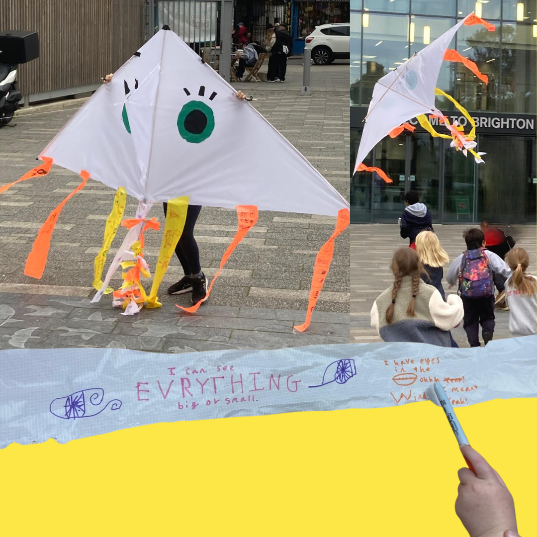 Workshop leader Laura Wilkinson had the brilliant idea of exploring narrative perspectives and point of view through the creation of an "all seeing eye"! With artist Darren East's help, the children of this Brighton club crafted a kite with a giant eye on it, complete with streamers bearing their words.